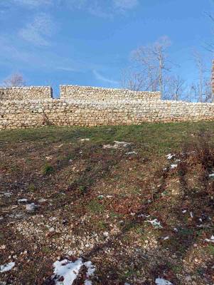 Зидови су лоше очувани у висину од 2 до три реда камених блокова. На југоисточној страни акрополе, на простору између малог улаза у утврђење и апсиде цркве, подигнут је објекат, димензија: 6,25 x 5,13 м. Објекат се пружа паралелно са правцем пружања бедема на тај начин формирајући неку врсту пролаза ка цркви, широког 1,70 м. Овај пролаз се, од малог улаза у утврђење, пружа све до полукружне куле на западној страни. Зидови објекта, широки 0,60 м, рађени су од већих, необрађених или приклесаних, камених блокова ређаних у правилне хоризонталне редове спојене кречним малтером са крупнијим рјечним агрегатом. Очувани су у висину од 0,55 м, на сјеверној до 1,20 м на јужној страни.